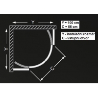 Sprchový kout čtvrtkruhový s dvoudílnými posuvnými dveřmi.
