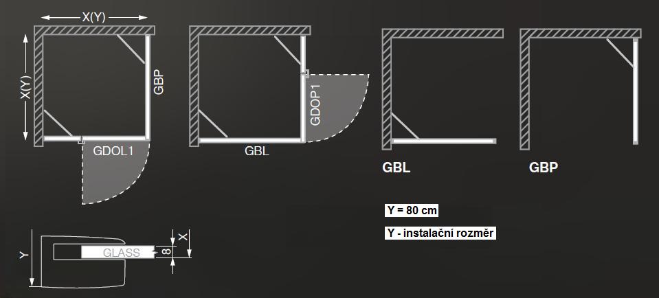 ** udávané instalační rozměry jsou platné pro samostatně stojící boční stěnu při kombinaci s dveřmi je nutné připočítat +20 mm