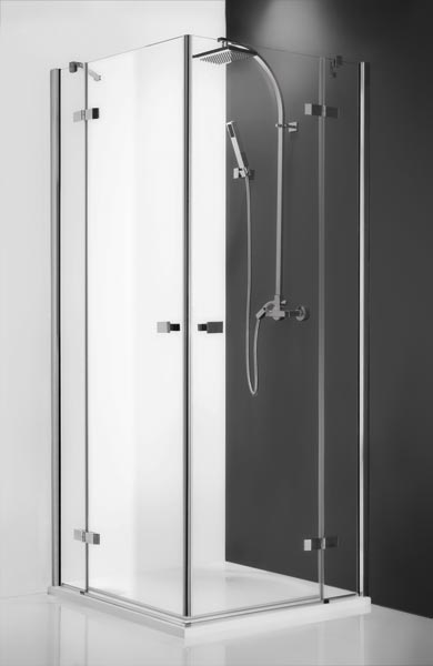 Čtvercový sprchový kout s dvoukřídlými otevíracími dveřmi.