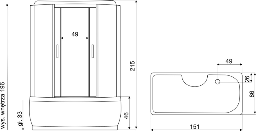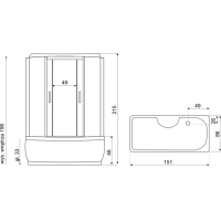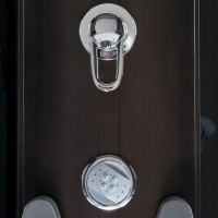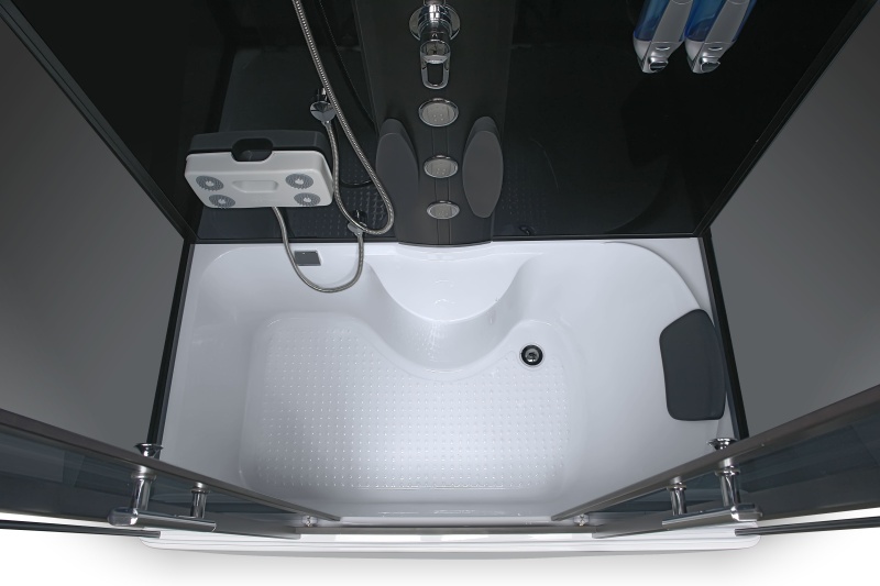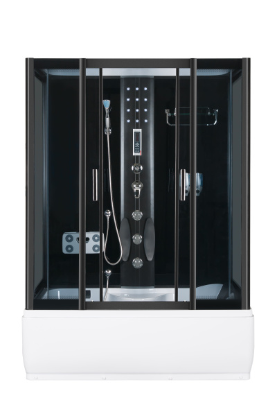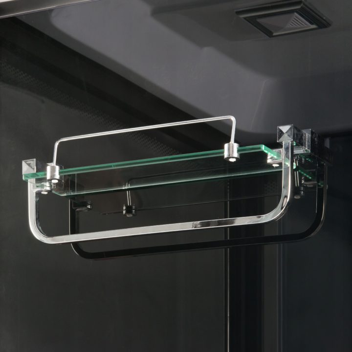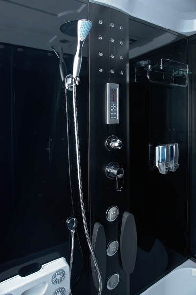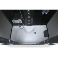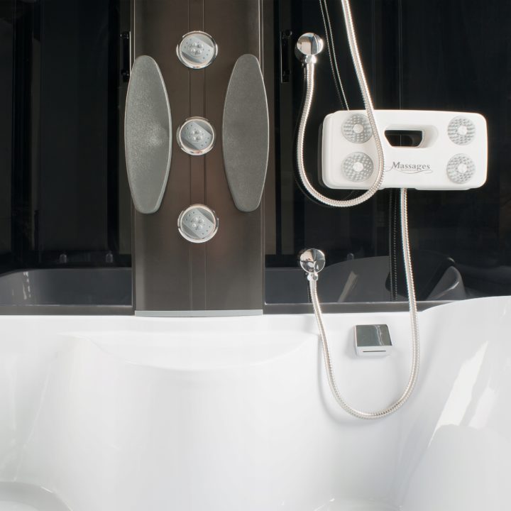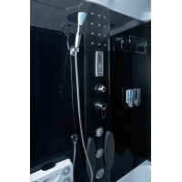 • Kabina je vybavena ovládacím panelem s možností připojení telefonu, rádia, ventilátoru, masáže nohou, LED osvětlení, skleněné police se zábradlím, dávkovače mýdla / šamponu