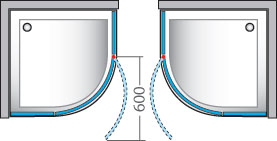 Sprchový kout čtvrtkruhový s jednokřídlými dveřmi.