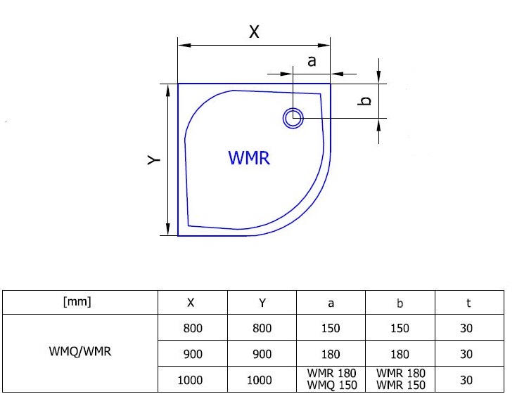 Sprchové vaničky Marblemate WMR jsou čtvrtkruhové samonosné vaničky s možností postavení na nožičky i na podlahu. Výška ustavovacích nožiček sprchové vaničky je 65 - 105 mm. Maximální rozměry jsou 1000 mm.