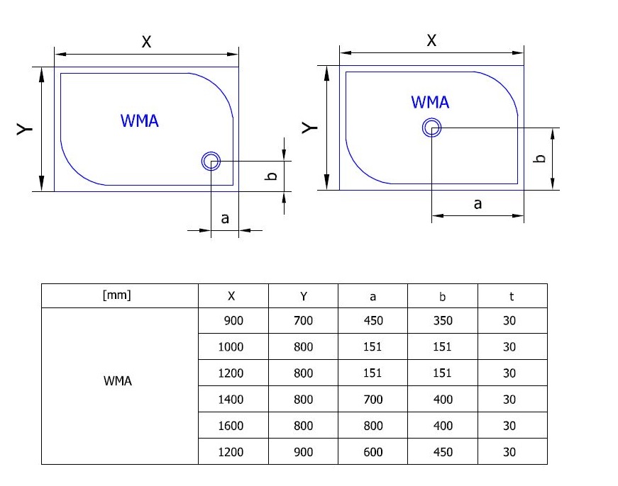 Sprchové vaničky Marblemate WMA jsou obdélníkové samonosné vaničky s možností postavení na nožičky i na podlahu. Výška ustavovacích nožiček sprchové vaničky je 65 - 105 mm. Maximální rozměry jsou 900 x 1200 mm.