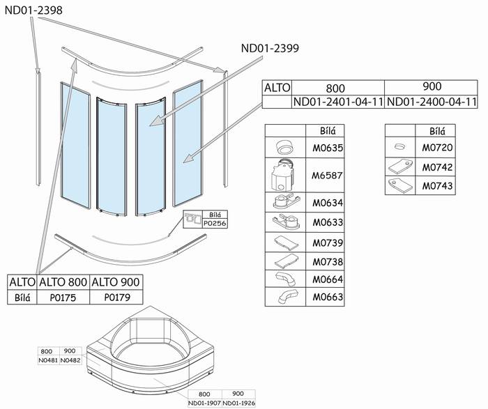 Náhradní díly na sprchový kout čtvrtkruhový s posuvnými dveřmi Roltechnik ALTO 80