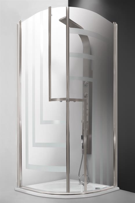 Sprchový kout čtvrtkruhový s dvoukřídlými dveřmi, výplň čiré sklo s potiskem.
