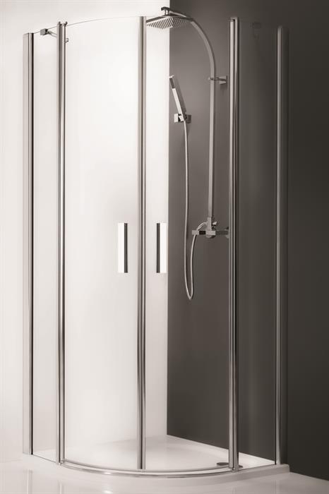 Sprchový kout čtvrtkruhový s dvoukřídlými dveřmi, výplň transparent.