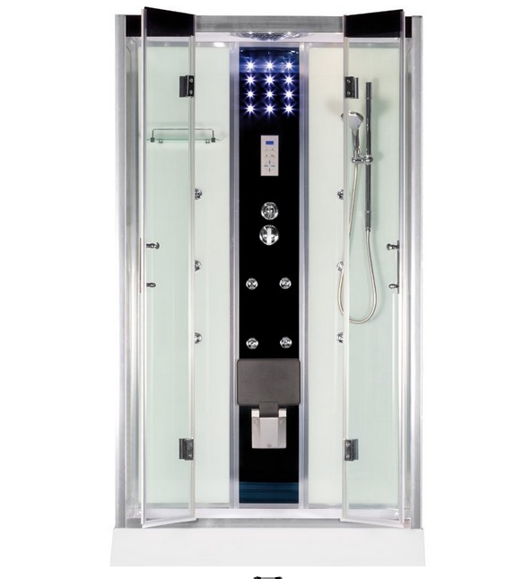 • Kabina je vybavena dotykovým ovládacím panelem s možností připojení telefonu, LED osvětlení, rádio, ventilátor, sklopné sedadlo, skleněná police