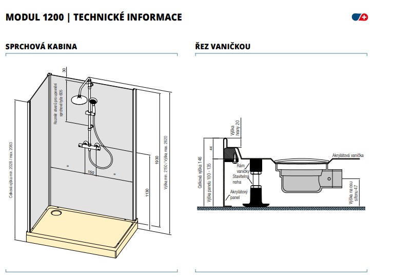 • Akrylátová vanička umístěna na svařovaném rámu a vyztužená na spodní straně skleněnými vlákny o celkové