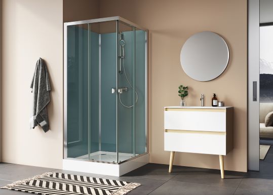 Inovativní a nadčasová sprchová kabina MODUL1200 (D20SE2) od SanSwiss se speciální akrylátovou čtvercovou vaničkou 90x90cm, se 2 zadními stěnami z bezpečnostního lakovaného skla s antiplakovou úpravou Aquaperle, jedná se o rohový vstup s dvoudílnými posuvnými dveřmi řady ARELIA D20SE2. Varianta baterie 4 – termostatická baterie s ruční a hlavovou sprchou. Čiré sklo. Jedná se o řešení do rohu.