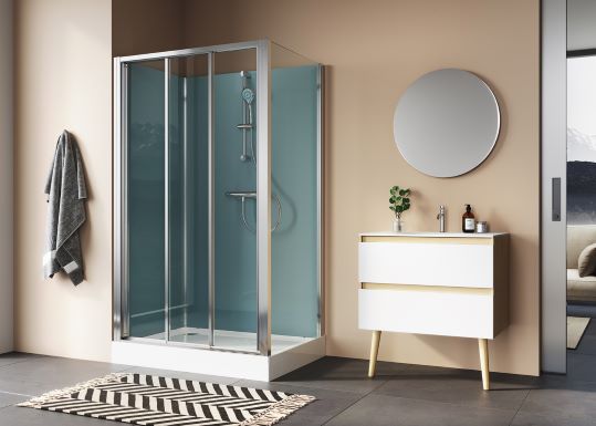 Inovativní a nadčasová sprchová kabina MODUL1200 (D20K+D20FM) od SanSwiss se speciální akrylátovou obdélníkovou vaničkou 80x100cm, se 2 zadními stěnami z bezpečnostního lakovaného skla s antiplakovou úpravou Aquaperle, s třídílnými posuvnými dveřmi řady ARELIA D20S3 a boční stěnou v 90° D20FM. Varianta baterie 3 – termostatická baterie s ruční sprchou. Čiré sklo. Jedná se o řešení do rohu.